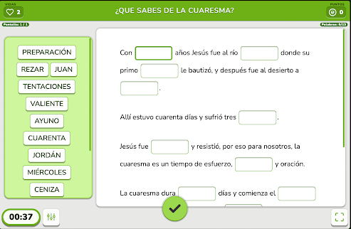 Es el tiempo de preparación para la Pascua. Dura 40 días, en recuerdo del tiempo que Jesús pasó en el desierto preparándose para empezar su vida pública, después de ser bautizado por su primo Juan en el río Jordán.